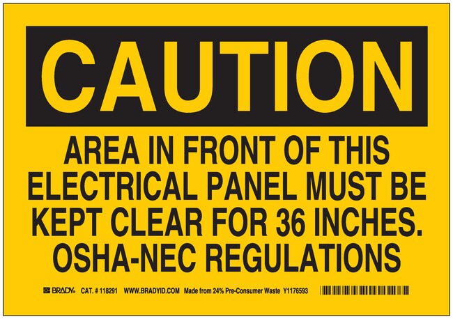 Brady™ Eco-Friendly Signs: CAUTION: AREA IN FRONT OF THIS ELECTRICAL PANEL MUST BE KEPT CLEAR FOR 36 INCHES OSHA-NEC REGULATIONS