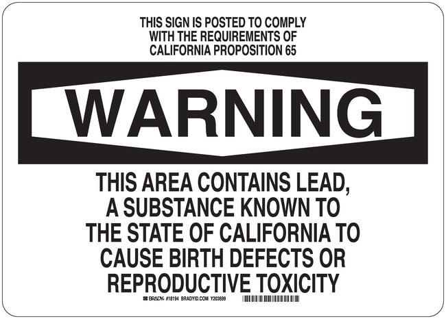 Displayed Text THIS AREA CONTAINS LEAD, A SUBSTANCE KNOWN TO THE STATE OF CALIFORNIA TO CAUSE BIRTH DEFECTS OR REPRODUCTIVE TOXICITY