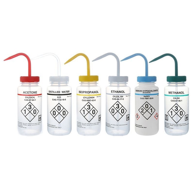 Chemglass 500 mL LDPE self-venting wash bottles provide safe, leak-resistant dispensing and easy filling for laboratory washing and dispensing tasks. The wide mouth simplifies filling and cleaning, while a molded, one-piece closure and stem provide a uniform stream; the tip can be trimmed to increase flow. Supplied as a pack of six, these self-labeling bottles include a non-metallic vent to reduce solvent leakage.