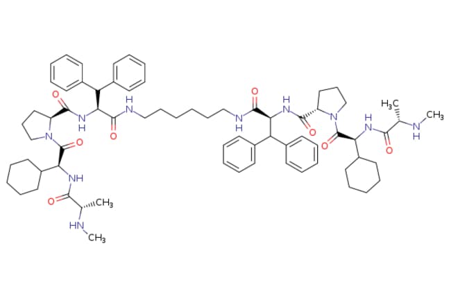 Ambeed | (2S,2'S)-N,N'-((2S,2'S)-(Hexane-1,6-diylbis(azanediyl))bis(1-oxo-3,3-diphenylpropane-1,2-diyl))bis(1-((S)-2-cyclohexyl-2-((S)-2-(methylamino)propanamido)acetyl)pyrrolidine-2-carboxamide) | 50mg | 525877460 | A357114 | | 1001600-56-1 | MFCD28168021 | 1205.600 | C70H96N10O8