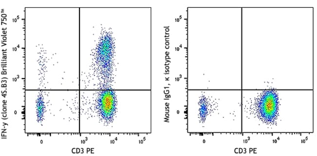 Brilliant Violet 750™ anti-human IFN-γ [4S.B3]; Isotype: Mouse IgG1, κ; Reactivity: Human, Cross-Reactivity: Chimpanzee, Baboon, Cynomolgus, Rhesus; Apps: ICFC; Size: 100 tests