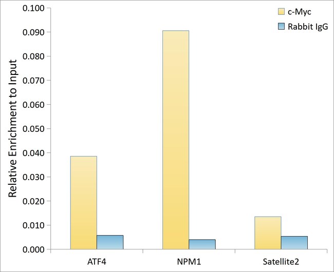 The c-Myc protein is a 62 kDa transcription factor that is encoded by the c-Myc gene on human chromosome 8q24. c-Myc is commonly activated in a variety of tumor cells and plays an important role in cellular proliferation, differentiation, apoptosis and cell cycle progression. The phosphorylation of c-Myc has been investigated and previous studies have suggested a functional association between phosphorylation at Thr58/Ser62 by glycogen synthase kinase 3, cyclin dependent kinase, ERK2 and C-Jun N terminal Kinase (JNK) in cell proliferation and cell cycle regulation. Studies have shown that c-Myc is essential for vasculogenesis and angiogenesis in tumor development, which distributes blood throughout the cells. The c-myc oncogene (p62 c-myc) is involved in the control of normal cellular proliferation and differentiation, and the deregulated expression of c-Myc induces apoptosis in different cell types. Antibodies against c-myc epitopes recognize overexpressed proteins containing Myc epitope tag fused to either amino- or carboxy-termini of targeted proteins. c-Myc-, N-Myc- and L-Myc-encoded proteins function in cell proliferation, differentiation and neoplastic disease. Amplification of the c-Myc gene has been found in several types of human tumors including lung, breast and colon carcinomas, while the N-Myc gene has been found amplified in neuroblastomas. Translocation of the c-myc locus on chromosome 8 to the immunoglobulin loci on chromosome 14 (heavy chain); 2 (delta light chain); or 22 (light chain) is described in Burkitts lymphoma and other B-cell lymphoproliferative conditions. An aberrant expression of the c-myc gene occurs in tumors of different origins such as colorectal, gastric, gallbladder, hepatic, mammary, ovarian, endometrial, head and neck, pulmonary, prostatic, thyroidal, oral, ocular, nasopharyngeal, endocrine, as well as hematopoietic neoplasms.