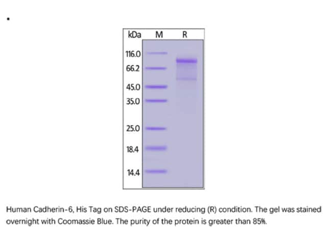 Recombinant Protein;Human Cadherin-6 / KCAD / CDH6 Protein;100UG;Human Cadherin-6, His Tag (CA6-H5229) is expressed from human 293 cells (HEK293). It contains AA Thr 19 - Ala 615 (Accession # AAH00019).;This protein carries a polyhistidine tag at the C-terminus. The protein has a calculated MW of 67.2 kDa. The protein migrates as 90-100 kDa under reducing (R) condition (SDS-PAGE) due to glycosylation.