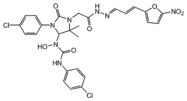 A cell-permeable oxo-imidazolidinyl-hydroxyurea that preferentially localizes to ER, where it interacts with AAA (ATPase associated with diverse cellular activities) ATPase p97 ( K d = 5 - 10μM) via its nitrofuran-containing moiety, without exhibiting affinity toward Hsp70 or AAA ATPase NSF (N-methylmaleimide-sensitive factor). Evidence indicates that EerI cellular metabolite, but not EerI itself, is responsible for the inhibition of ER membrane translocon sec61 complex-mediated transfer of newly synthesized polypeptide, resulting in a blockage of ER-mediated posttranslational glycosylation and signal peptide removal (Effective conc. = 8μM in HepG2 and HeLa cultures). Ether independent or as a consequence of the early effect on sec61 complex, EerI culture treatment also induces a selective dissociation of an 180 kDa protein from the atx3-containing p97/VCP (Valosin-containing protein) complex and a blockage of the complex-associated deubiquitination of ERAD (ER-associated protein degradation) substrates in a reversible manner, resulting in an accumulation of polyubiquitinated proteins (Effective conc. = 10μM in A9 and 293T cultures). EerI culture treatment (10μM) is also demonstrated to selectively induce cytotoxicity in lymphoid cell lines, BJAB, HBL-2, JEKO-1, Jurkat, KMS-12, MINO, as well as primary leukemia cells from CLL (chronic lymphocytic leukemia) patients, but not PBMC from healthy donors, by upregulating the BH3-only pro-apoptotic protein NOXA in cancer cells via ATF3/4 activation and a downregulation of H2A ubiquitination. Unlike DBeQ (Cat. No. 506190), EeRI does not inhibit p97 ATPase activity.