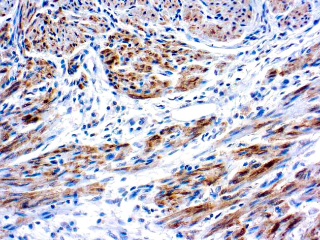This antibody is specific to high molecular weight (120-150 kDa) h-caldesmon. Caldesmon is involved in smooth muscle and non-muscle contraction. Two closely related variants of human caldesmon have been identified. The hcaldesmon variant is predominantly expressed in smooth muscle, whereas lcaldesmon (71-80 kD) is found in non-muscle tissue and cells.
