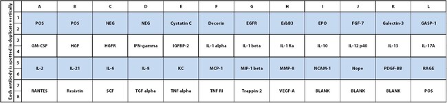 Detects 40 Canine Cytokines. Suitable for all liquid sample types. Semi-Quantitative, Sandwich-based, Membrane Antibody Array. Screen and compare protein expression levels with high specificity and sensitivity (pg/ml levels). No dedicated equipment required. Compatible with any chemiluminescent imaging system. Proteins detected: Cystatin C, Decorin, EGFR, ErbB3, Erythropoietin, FGF-7 (KGF), Galectin-3, GASP-1 (WFIKKNRP), GM-CSF, GRO alpha (CXCL1), HGF, HGFR, IFN-gamma, IGFBP-2, IL-1 alpha (IL-1 F1), IL-1 beta (IL-1 F2), IL-1 Ra (IL-1 F3), IL-10, IL-12 p40, IL-13, IL-17A, IL-2, IL-21, IL-6, IL-8 (CXCL8), MCP-1 (CCL2), MIP-1 beta (CCL4), MMP-8, NCAM-1 (CD56), Nope, PDGF-BB, RAGE, RANTES (CCL5), Resistin, SCF, TGF alpha, TNF alpha, TNF RI (TNFRSF1A), Trappin-2, VEGF-A