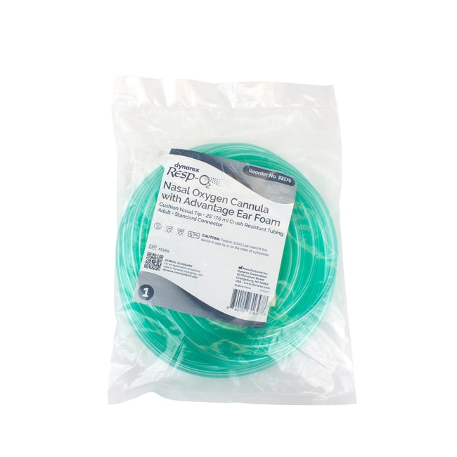 Dynarex Resp-O2 Nasal Oxygen Cannulas with Cushion Tips and Advantage Ear Foam are designed to efficiently deliver supplemental oxygen to respiratory patients. These translucent cannulas come with either Standard or Universal connectors and feature light green oxygen supply tubing, designed to help improve tube visibility. Adjustable sponge-foam ear wraps and cushioned nasal prongs provide added comfort and help minimize the risk of irritation Includes crush-resistant, star lumen oxygen supply tubing Individually wrapped Not made with natural rubber latex or DEHP
