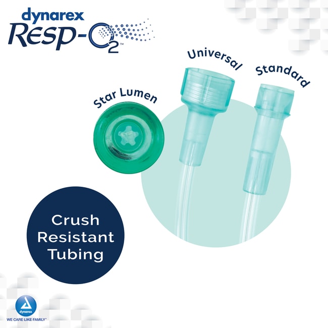 Dynarex Resp-O2 Nasal Oxygen Cannulas with Cushion Tips and Ultra Soft Ear Foam are designed to efficiently deliver supplemental oxygen to respiratory patients. The cannulas come with either Standard or Universal connectors and feature light green oxygen supply tubing, designed to help improve tube visibility.