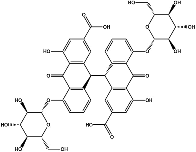 Sennoside B (CAS 128-57-4) is a naturally occurring anthraquinone glycoside present in various organisms including puffer fish salamanders and amphibian skin As a known stimulant laxative Sennoside B acts primarily by increasing colonic peristalsis through irritation of the intestinal mucosa facilitating bowel movements This mechanism involves the hydrolysis of sennosides by intestinal bacteria resulting in active metabolites that modulate water and electrolyte secretion in the colon In biomedical research Sennoside B is utilized for studies on gastrointestinal motility drug transport and as a model compound in assays assessing intestinal drug absorption and excretion dynamics