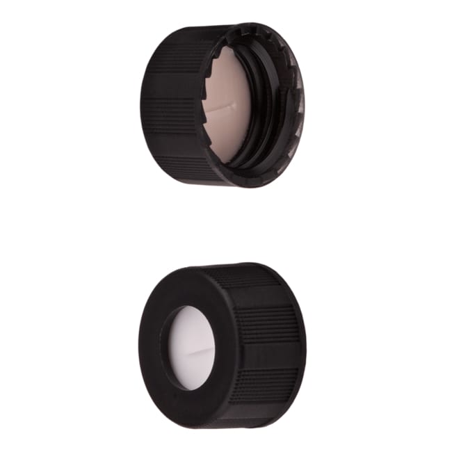 Caps, Screw Top, with White Silicone Rubber / Natural PTFE Pre-Slit Septa, fitted in knurled, polypropylene, Black Caps. For use with 9-425mm thread, 12x32mm autosampler vials. BASIK Brand. 100/PK.