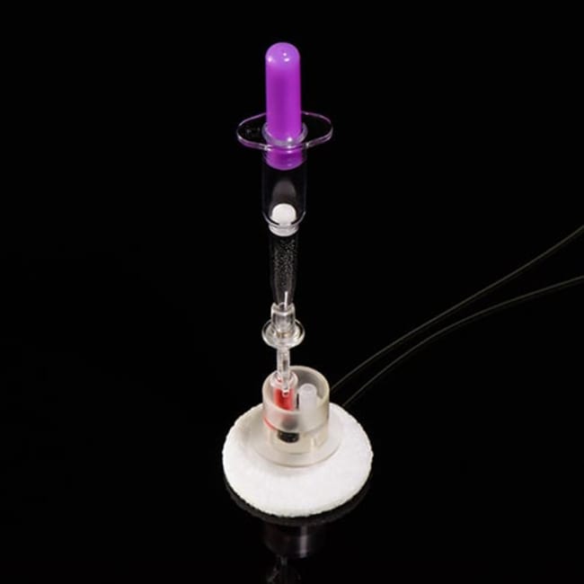 The PNP3MS connector easily presses onto the tubes and then punctures the small septum on Vascular Access Buttons™ and PinPorts™ to draw up the sample. You can take samples directly from a catheterized animal, or for completely hands off sampling, at the top of the cage. Arterial pressure is required for best results (for example, from a carotid artery catheterization).