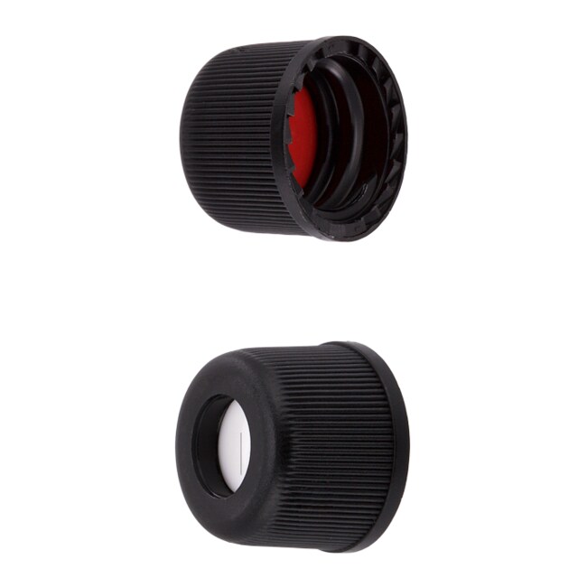 Caps, Screw Top, with Silicone Rubber / PTFE Pre-Slit Septa, fitted in knurled, polypropylene, Black Caps. For use with 8-425mm thread, 12x32mm autosampler vials. BASIK Brand. 1000/CS.