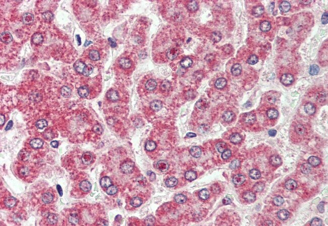 Percent identity with other species by BLAST analysis: Human, Chimpanzee, Gorilla, Orangutan, Gibbon, Monkey, Galago, Marmoset, Mouse, Rat, Hamster, Elephant, Panda, Bat, Bovine, Rabbit, Horse, Pig, Opossum, Guinea pig (100%); Zebra finch, Platypus, Lizard (93%); Xenopus, Stickleback, Pufferfish, Zebrafish (80%). For IHC(P), use heat induced antigen retrieval in pH 6.0 citrate buffer. After incubation with the primary antibody, slides were incubated with biotinylated secondary antibody, followed by alkaline phosphatase-streptavidin and chromogen.