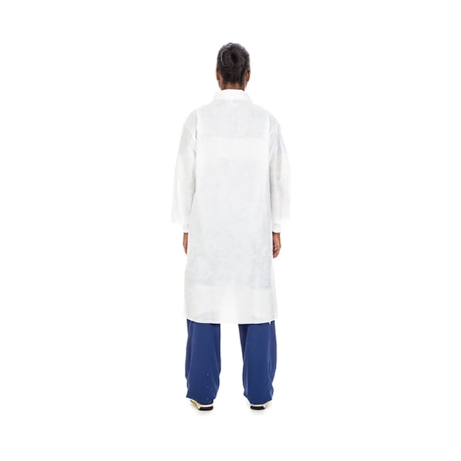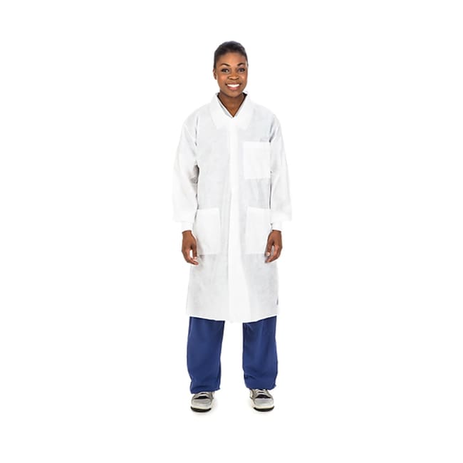 Standard lab coats protect from low fluid levels. Choose from blue or white with traditional or knit collar.