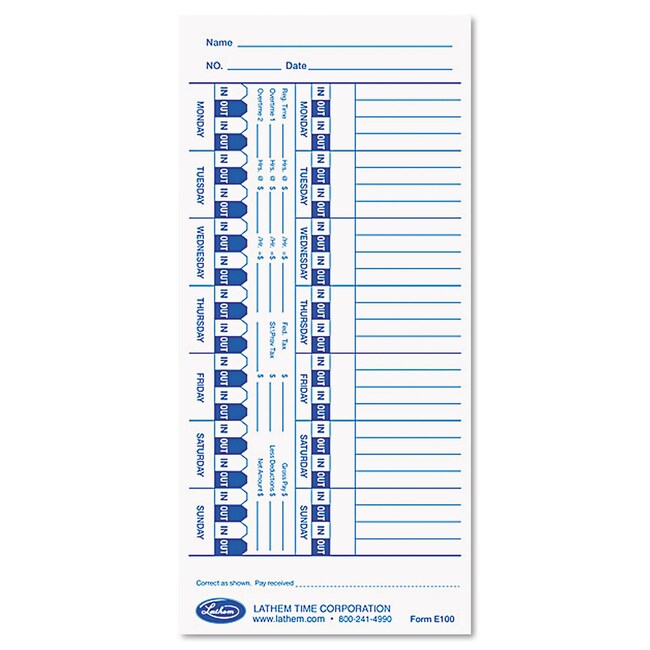 In/Out indicators on outside edge for more accurate print alignment Gross to net payroll deduction area Employee signature line for verification of time worked For Lathem E-Series Time Recorders Size- 4x9 Time Period- Weekly Printing Sides- One Side Card Quantity- 100