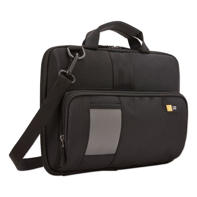A hard-shell laptop case with protective thick padding and molded ridges for airflow which allows for in-case use Elastic corner loops help keep laptop secure Front accessory pocket stores cords and other small daily items Zipper opens to provide access to charging port Clear ID slot on exterior for easy identification Padded handles and removable padded shoulder strap provide multiple carrying options For Use With- Laptops Color(s)- Black Color Family- Black Material(s)- Polyester