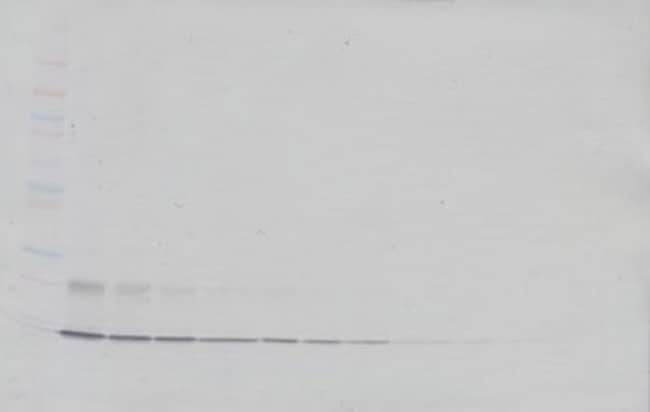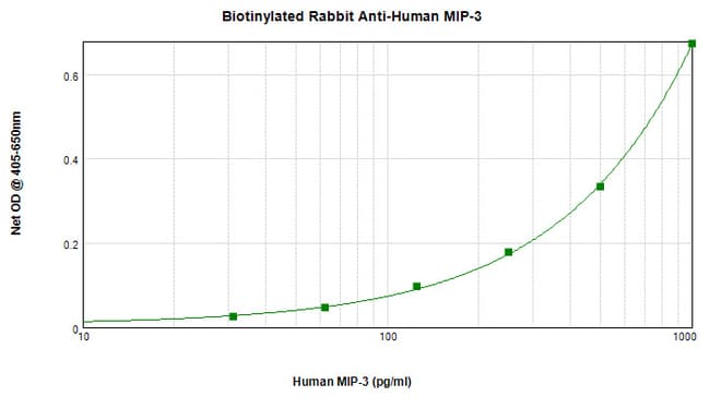 AA Sequence of recombinant protein: RVTKDAETEF MMSKLPLENP VLLDRFHATS ADCCISYTPR SIPCSLLESY FETNSECSKP GVIFLTKKGR RFCANPSDKQ VQVCMRMLKL DTRIKTRKN. Preparation: Produced from sera of rabbits immunized with highly pure Recombinant Human MIP-3 (CCL23). Anti-Human MIP-3 (CCL23)-specific antibody was purified by affinity chromatography and then biotinylated. Sandwich ELISA: To detect Human MIP-3 (CCL23) by sandwich ELISA (using 100 μL/well antibody solution) a concentration of 0.25-1.0 μg/mL of this antibody is required. This biotinylated polyclonal antibody, in conjunction with PeproTech Polyclonal Anti-Human MIP-3 (CCL23) (500-P124) as a capture antibody, allows the detection of at least 0.2-0.4 ng/well of Recombinant Human MIP-3 (CCL23). Western Blot: To detect hMIP-3 by Western Blot analysis this antibody can be used at a concentration of 0.1-0.2 μg/mL. Used in conjunction with compatible secondary reagents the detection limit for Recombinant hMIP-3 is 1.5-3.0 ng/lane, under either reducing or non-reducing conditions. 500-P124BT-1MG will be provided as 2 x 500 μg