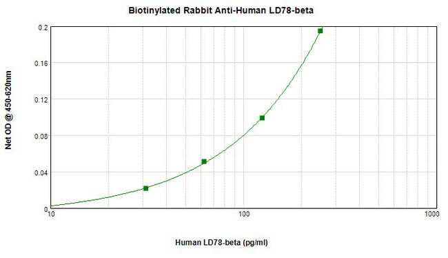 AA Sequence of recombinant protein: APLAADTPTA CCFSYTSRQI PQNFIADYFE TSSQCSKPSV IFLTKRGRQV CADPSEEWVQ KYVSDLELSA. Preparation: Produced from sera of goats immunized with highly pure Recombinant Human LD78beta (CCL3L1). Anti-Human LD78beta (CCL3L1)-specific antibody was purified by affinity chromatography and then biotinylated. Sandwich ELISA: To detect Human LD78beta by sandwich ELISA (using 100 μL/well antibody solution) a concentration of 0.25-1.0 μg/mL of this antibody is required. This biotinylated polyclonal antibody, in conjunction with PeproTech Polyclonal Anti-Human LD78beta (500-P187G) as a capture antibody, allows the detection of at least 0.2-0.4 ng/well of Recombinant Human LD78beta. Western Blot: To detect Human LD78beta by Western Blot analysis this antibody can be used at a concentration of 0.1-0.2 μg/mL. When used in conjunction with compatible secondary reagents, the detection limit for Recombinant Human LD78beta is 1.5-3.0 ng/lane, under either reducing or non-reducing conditions. 500-P187GBT-1MG will be provided as 2 x 500 μg