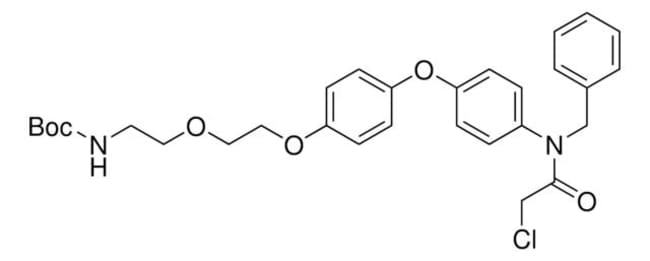 Protein degrader building block CCW16-PEG1-BocNH enables the synthesis of molecules for targeted protein degradation and PROTAC (proteolysis-targeting chimeras) technology. This conjugate contains a RING finger protein 4 (RNF4)-recruiting ligand, a PEGylated crosslinker, and a pendant amine for reactivity with a carboxylic acid on the target ligand. Because even slight alterations in ligands and crosslinkers can affect ternary complex formation between the target, E3 ligase, and PROTAC, many analogs are prepared to screen for optimal target degradation. When used with other protein degrader building blocks with a terminal amine, parallel synthesis can be used to more quickly generate PROTAC libraries that feature variation in crosslinker length, composition, and E3 ligase ligand.Technology Spotlight: Degrader Building Blocks for Targeted Protein DegradationPortal: Building PROTAC™ Degraders for Targeted Protein DegradationCovalent Ligand Screening Uncovers a RNF4 E3 Ligase Recruiter for Targeted Protein Degradation ApplicationsTargeted Protein Degradation by Small MoleculesSmall-Molecule PROTACS: New Approaches to Protein DegradationTargeted Protein Degradation: from Chemical Biology to Drug DiscoveryPROTAC is a registered trademark of Arvinas Operations, Inc., and is used under license