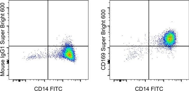 This 7-239 monoclonal antibody reacts with human CD169, also known as Siglec-1 and Sialoadhesin. This type I transmembrane protein is a member of the sialic acid binding Ig-like lectin (Siglec) family. Expressed on macrophages and dendritic cells in peripheral blood, lymph nodes, and spleen in humans, CD169 binds glycoproteins and glycolipids containing N-acetylneuraminyl alpha 2-3-galactose. CD169 expression can also be induced on CD14+ monocytes by interferon-alpha and interferon-gamma to mediate HIV-1 infection. Finally, CD169 has also been shown to be involved in antigen presentation to invariant NK T cells. This monoclonal antibody has been reported to inhibit erythrocyte binding to CD169-expressing cells. Applications Reported: This 7-239 antibody has been reported for use in flow cytometric analysis. Applications Tested: This 7-239 antibody has been pre-titrated and tested by flow cytometric analysis of normal human peripheral blood cells. This can be used at 5 μL (0.125 μg) per test. A test is defined as the amount (μg) of antibody that will stain a cell sample in a final volume of 100 μL. Cell number should be determined empirically but can range from 10^5 to 10^8 cells/test. Super Bright 600 is a tandem dye that can be excited with the violet laser line (405 nm) and emits at 600 nm. We recommend using a 610/20 bandpass filter. Please make sure that your instrument is capable of detecting this fluorochrome. When using two or more Super Bri...