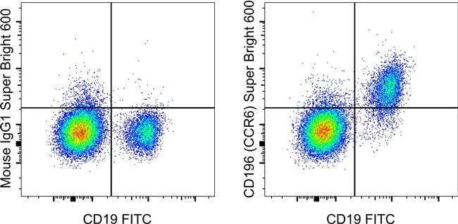 Description: This R6H1 monoclonal antibody reacts with CD196 (also known as CCR6), a seven transmembrane G protein-coupled receptor expressed on T, B, dendritic, natural killer, and Langerhans cells. This CC chemokine receptor uniquely binds MIP-3a/CCL20, a chemoattractant for dendritic cells, effector/memory T cells, and B cells. CD196 is also involved in host defense and inflammation at epithelial sites. Furthermore, this receptor has been implicated in Th17 differentiation and CD4+FoxP3+ regulatory T cell development. Applications Reported: This R6H1 antibody has been reported for use in flow cytometric analysis Applications Tested: This R6H1 antibody has been pre-titrated and tested by flow cytometric analysis on normal human peripheral blood cells. This can be used at 5 μL (0.5 μg) per test. A test is defined as the amount (μg) of antibody that will stain a cell sample in a final volume of 100 μL. Cell number should be determined empirically but can range from 10^5 to 10^8 cells/test. Super Bright 600 is a tandem dye that can be excited with the violet laser line (405 nm) and emits at 600 nm. We recommend using a 610/20 bandpass filter. Please make sure that your instrument is capable of detecting this fluorochrome When using two or more Super Bright dye-conjugated antibodies in a staining panel, it is recommended to use Super Bright Staining Buffer (cat. SB-4400) to minimize any non-specific polymer interactions.