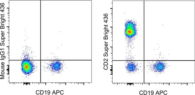 Description: The RPA-2.10 monoclonal antibody reacts with human CD2, a 50 kDa cell surface receptor expressed by a majority of thymocytes, all mature T cells and subset of NK cells. CD2 is a ligand for CD58 in the human and is involved in adhesion and activation of T cells. RPA-2.10 blocks mixed lymphocyte reaction. RPA-2.10 crossreacts to non-human primates and pigs. Applications Reported: This RPA-2.10 antibody has been reported for use in flow cytometric analysis. Applications Tested: This RPA-2.10 antibody has been pre-diluted and tested by flow cytometric analysis . This may be used at 5 μL (0.125 μg) per test. A test is defined as the amount (μg) of antibody that will stain a cell sample in a final volume of 100 μL. Cell number should be determined empirically but can range from 10^5 to 10^8 cells/test. Super Bright 436 can be excited with the violet laser line (405 nm) and emits at 436 nm. We recommend using a 450/50 bandpass filter, or equivalent. Please make sure that your instrument is capable of detecting this fluorochrome. When using two or more Super Bright dye-conjugated antibodies in a staining panel, it is recommended to use Super Bright Staining Buffer (Product No. SB-4400) to minimize any non-specific polymer interactions. Please refer to the datasheet for Super Bright Staining Buffer for more information. Excitation: 405 nm; Emission: 436 nm; Laser: Violet Laser