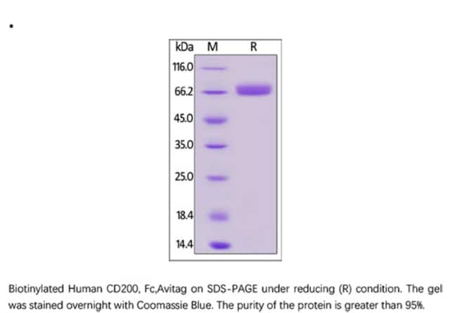 Recombinant Protein;Biotinylated Human CD200 / OX-2 Protein, Fc Tag, Avi Tag (Avitag™);200UG;Biotinylated Human CD200, Fc Tag, Avi Tag (OX2-H82F1) is expressed from human 293 cells (HEK293). It contains AA Gln 31 - Gly 232 (Accession # P41217-1).;This protein carries a human IgG1 Fc tag at the C-terminus, followed by a Avi tag (Avitag™). The protein has a calculated MW of 51.4 kDa. The protein migrates as 65-76 kDa under reducing (R) condition (SDS-PAGE) due to glycosylation.
