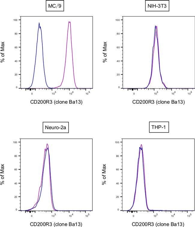 Description: This Ba13 monoclonal antibody recognizes mouse CD200R3, a surface receptor expressed by basophils and mast cells. Applications Reported: This Ba13 antibody has been reported for use in flow cytometric analysis. Applications Tested: This Ba13 antibody has been tested by flow cytometric analysis of MC/9 cell line. This may be used at less than or equal to 0.25 μg per test. A test is defined as the amount (μg) of antibody that will stain a cell sample in a final volume of 100 μL. Cell number should be determined empirically but can range from 10^5 to 10^8 cells/test. It is recommended that the antibody be carefully titrated for optimal performance in the assay of interest. Excitation: 488-561 nm; Emission: 578 nm; Laser: Blue Laser, Green Laser, Yellow-Green Laser.