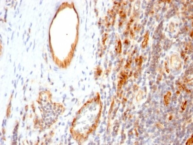 | CD31 (PECAM-1) is a transmembrane glycoprotein member of the immunoglobulin supergene family of adhesion molecules. CD31 is expressed by stem cells of the hematopoietic system and is primarily used to identify and concentrate these cells for experimental studies as well as for bone marrow transplantation. Anti-CD31 has shown to be highly specific and sensitive for vascular endothelial cells. Staining of nonvascular tumors (excluding hematopoietic neoplasms) is rare. CD31 MAb reacts with normal, benign, and malignant endothelial cells which make up blood vessel lining. The level of CD31 expression can help to determine the degree of tumor angiogenesis, and a high level of CD31 expression may imply a rapidly growing tumor and potentially a predictor of tumor recurrence. |