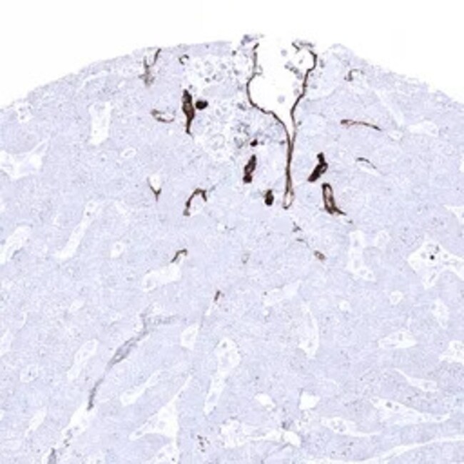 The CD34 antibody [MSVA-034R] HistoMAX™ (GTX04386) is a Rabbit Monoclonal antibody in the GeneTex HistoMAX portfolio. The antibody is extensively evaluated for IHC-P using formalin-fixed human normal tissues (more than 70 different sections) and cancer tissue arrays to guarantee specificity and best-in-class performance. Information regarding both manual and autostainer staining protocols are available.Figure Legend: IHC-P analysis of human liver tissue using GTX04386 CD34 antibody [MSVA-034R] HistoMAX. CD34 is only seen in portal vessels and periportal sinusoidal.