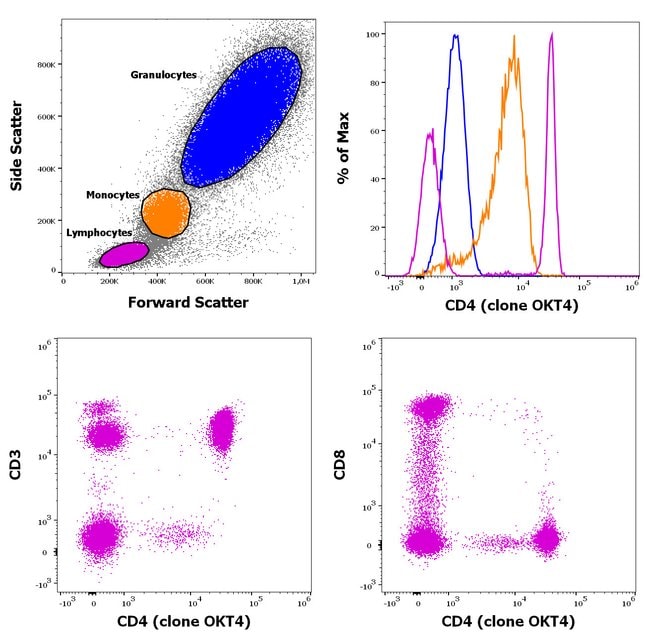Description: The OKT4 monoclonal antibody reacts with human CD4, a 59 kDa cell surface glycoprotein expressed by the majority of thymocytes, a subpopulation of mature T cells (T-helper cells) and in low levels on monocytes. CD4 is a receptor for the human immunodeficiency virus (HIV). The OKT4 antibody recognizes a different epitope than the RPA-T4 monoclonal antibody, and these antibodies do not cross-block binding to each other's respective epitopes. Applications Reported: This OKT4 (OKT-4) antibody has been reported for use in flow cytometric analysis. Applications Tested: This OKT4 (OKT-4) antibody is offered in 2 formats: - μg size: has been tested by flow cytometric analysis of normal human peripheral blood cells. This can be used at less than or equal to 0.25 μg per test. A test is defined as the amount (μg) of antibody that will stain a cell sample in a final volume of 100 μL. Cell number should be determined empirically but can range from 10^5 to 10^8 cells/test. It is recommended that the antibody be carefully titrated for optimal performance in the assay of interest. - test size: has been pre-titrated and tested by flow cytometric analysis of normal human peripheral blood cells. This can be used at 5 μL (0.125 μg) per test. A test is defined as the amount (μg) of antibody that will stain a cell sample in a final volume of 100 μL. Cell number should be determined empirically but can range from 10^5 to 10^8 cells/test.