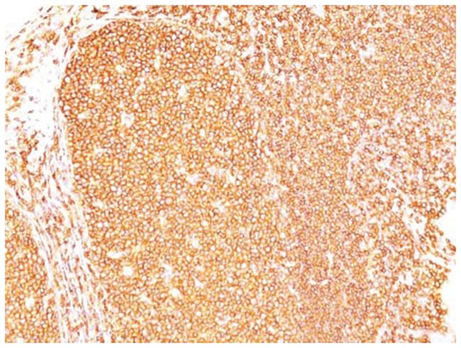 CD45R, also designated CD45 and PTPRC, has been identified as a transmembrane glycoprotein, broadly expressed among hematopoietic cells. Multiple isoforms of CD45R are distributed throughout the immune system according to cell type. These isoforms arise because of alternative splicing of exons 4, 5, and 6. The corresponding protein domains are characterized by the binding of monoclonal antibodies specific for CD45RA (exon 4), CD45RB (exon 5), CD45RC (exon 6) and CD45RO (exons 4 to 6 spliced out). The variation in these isoforms is localized to the extracellular domain of CD45R, while the intracellular domain is conserved. CD45R functions as a phosphor-tyrosine phosphatase. Antibody to CD45 is useful in differential diagnosis of lymphoid tumors from non-hematopoietic undifferentiated neoplasms. | |