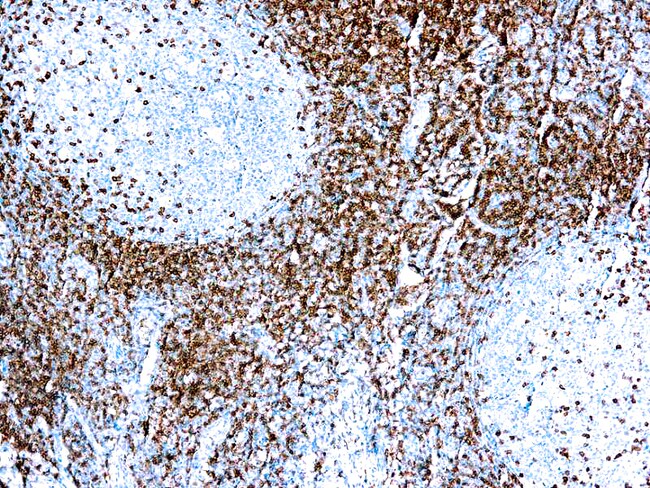 This antibody recognizes CD5, which is a transmembrane protein, is found on 95%of thymocytes and 72% of peripheral blood lymphocytes. In lymph nodes, the main reactivity is observed in T cell areas. CD5 is expressed by many T cell leukemia, lymphomas, and activated T cells. Occasionally, CD5 antigen is also expressed on a subset of B cells. Mantle cell lymphomas(same as diffuse centrocytic lymphomas) are CD5(+) while the follicle center cell lymphoma are CD5(-).