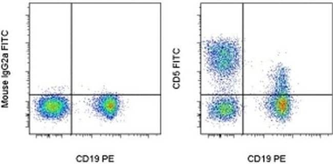 Description: The L17F12 monoclonal antibody reacts with human CD5, a 67 kDa protein expressed by a majority of thymocytes and mature T cells and a subset of B cells. Signaling through the CD5 molecule activates T cells and binding of CD5 to its ligand on B cells, CD72, and plays an important role in T-B interaction and proliferation. Applications Reported: This L17F12 antibody has been reported for use in flow cytometric analysis. Applications Tested: This L17F12 antibody has been pre-titrated and tested by flow cytometric analysis of normal human peripheral blood cells. This can be used at 5 μL (0.125 μg) per test. A test is defined as the amount (μg) of antibody that will stain a cell sample in a final volume of 100 μL. Cell number should be determined empirically but can range from 10^5 to 10^8 cells/test. Excitation: 488 nm; Emission: 520 nm; Laser: Blue Laser. Filtration: 0.2 μm post-manufacturing filtered.