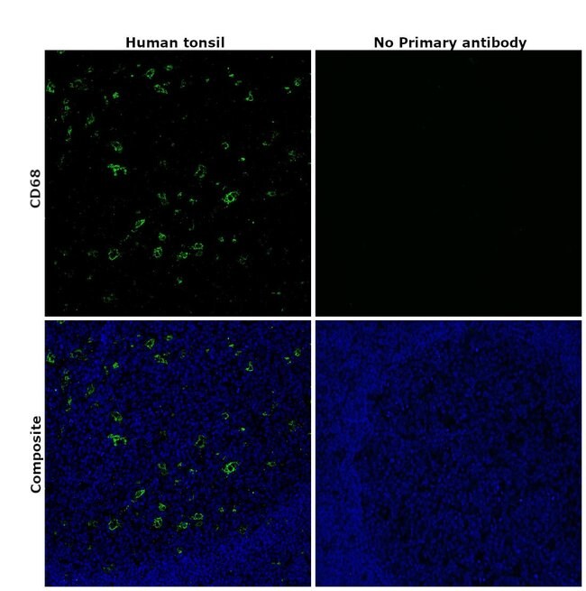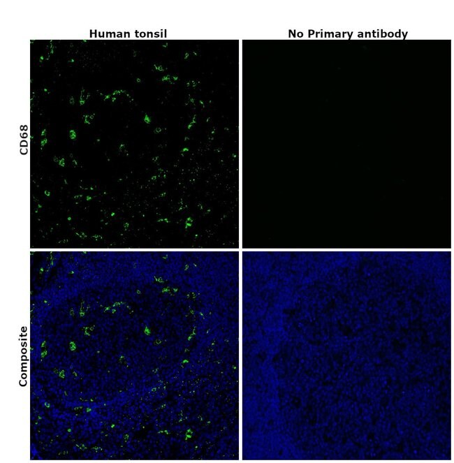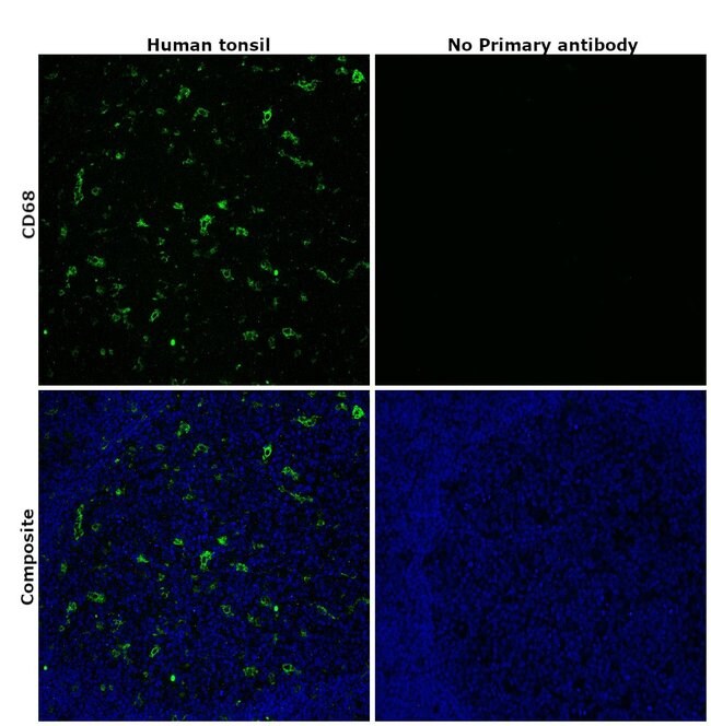 CD68 (Macrosialin) is a 110 kDa integral membrane glycoprotein predominantly expressed on the intracellular lysomsomes of monocytes and macrophages and to a lesser extent by dendritic cells and peripheral blood granulocytes. Also, CD68 could play a role in phagocytic activities of tissue macrophages, both in intracellular lysosomal metabolism and extracellular cell-cell and cell-pathogen interactions. CD68 is expressed by interdigitating reticulum cells in tonsil and some histiocytic lymphoma or histiocytosis, acute myeloid leukemia (AML), and granulocytic sarcoma. Elevated expression of CD68 has been demonstrated on CD34+ cells in various human malignancies, including several Acute Myeloid Leukemia studies.Specifications