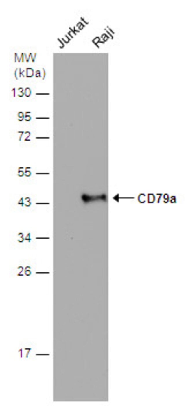 CD79a is a disulphide-linked heterodimer that includes B29 (CD79b) polypeptide. CD79a is a B lymphocyte antigen receptor with an antigen-specific surface component Ig (immunoglobulin) that associates with Ig-alpha and Ig-beta, necessary elements for the expression and function of the B-cell antigen receptor. CD79a first appears at pre-B cell stage and persists until the plasma cell stage where it is found as an intracellular component. CD79a is found in the majority of acute leukemias of precursor B cell type, in B cell lines, B cell lymphomas, and in some myelomas. It is not present in myeloid or T cell lines. Diseases associated with CD79a include Agammaglobulinemia 3 and Agammaglobulinemia, Non-Bruton type.