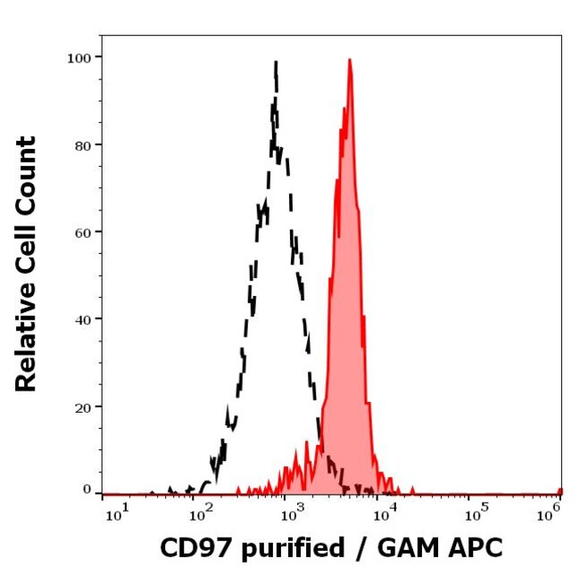 This antibody recognizes a unique epitope on CD97, a 75-85 kDa surface glycoprotein of G-protein-coupled receptor family, expressed on activated B and T lymphocytes, monocytes/macrophages, dendritic cells and granulocytes.