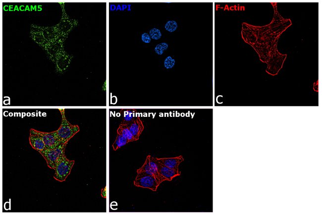 CEA (Carcino Embryonic Antigen, CD66e) is synthesized during development in the fetal gut, and re-expressed in increased amounts in intestinal carcinomas and several other tumors. CEA is a member of carcinoembryonic antigens, immunoglobulin supergene family and consists of a single N domain (structural homology to the immunoglobulin variable) and six immunoglobulin constant-like A (A1, A2, A3) and B domains (B1, B2, B3). Antibodies to CEA are useful in identifying the origin of various metastatic adenocarcinomas and in distinguishing pulmonary adenocarcinomas (60 to 70% are CEA+) from pleural mesotheliomas (rarely or weakly CEA+). CEA is a member of a large family of glycoproteins, a useful tumor marker for adenocarcinoma, and found in adenocarcinomas of endodermally derived digestive system epithelium and fetal colon. Two subgroups of the CEA family, the CEA cell adhesion molecules and the pregnancy-specific glycoproteins, are located within a 1.2 Mb cluster on the long arm of chromosome 19. Eleven pseudogenes of the CEA cell adhesion molecule subgroup are also found in the cluster. CEA was originally described in bile ducts of liver as biliary glycoprotein. Subsequently, CEA was found to be a cell-cell adhesion molecule detected on leukocytes, epithelia, and endothelia. The encoded protein mediates cell adhesion via homophilic as well as heterophilic binding to other proteins of the subgroup. Multiple cellular activities have been attributed to the encoded protein, including roles in the differentiation and arrangement of tissue three-dimensional structure, angiogenesis, apoptosis, tumor suppression, metastasis, and the modulation of innate and adaptive immune responses. Multiple transcript variants encoding different isoforms have been reported, but the full-length nature of all variants has not been defined.