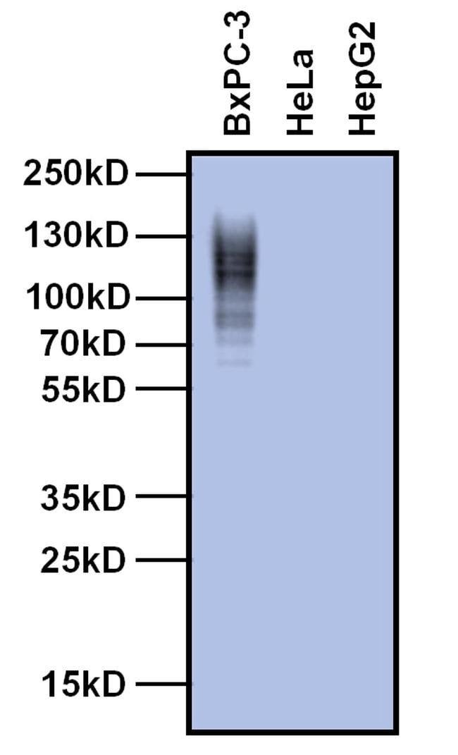 The predicted MW of CEA is ~77kD, but by Western blot MIC0101 detects CEA with varying degrees of glycosylation at ~77-180kD. MIC0101 was formerly sold as a Seradyn product. Material can be stored for at least 6 months at 2-8°C, or up to 4 years when stored at -20°C.