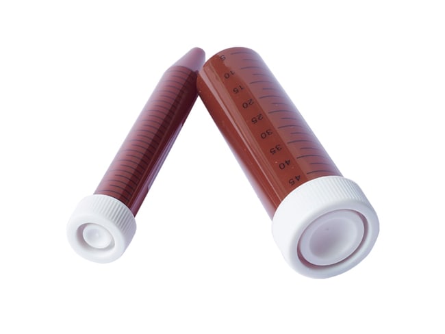 The CellProAmber Centrifuge Tubes are engineered for superior sample protection and performance Constructed from durable polypropylene (PP) these conical tubes feature an amber design to safeguard light-sensitive materials by significantly reducing light penetration Each tube is paired with a high-density polyethylene (HDPE) cap ensuring a secure leak-proof seal for reliable sample containment Amber Design for Light Protection Shields light-sensitive samples from degradation by minimizing light transmission HDPE Caps High-density polyethylene caps provide a tight secure fit to prevent leaks and maintain sample integrity during storage and centrifugation High Centrifugal Strength Robust design supports high-speed centrifugation with maximum RCF ratings of 13000 x g for 15 mL tubes and 14000 x g for 50 mL tubes Chemical Resistance Made from chemically resistant materials suitable for a variety of applications Bulk Packaging Conveniently packed with 500 tubes per case to meet the n