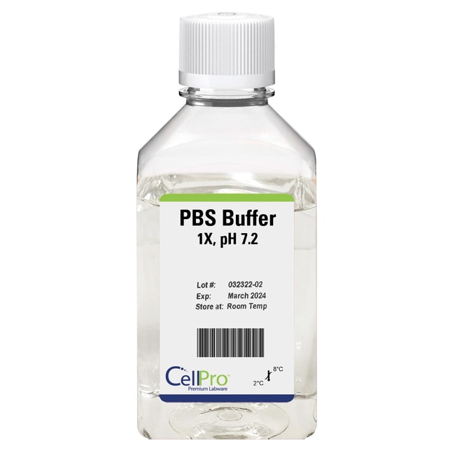 CellPro™ PBS Buffer, 1X pH 7.2, 1 Liter Phosphate-buffered saline (PBS) is a balanced salt solution that is used for a variety of cell culture applications, such as washing cells before dissociation, transporting cells or tissue samples, diluting cells for counting, and preparing reagents. PBS is formulated without calcium and magnesium for rinsing chelators from the culture before cell dissociation. Concentrated forms of Gibco™ PBS may require pH adjustment at the time of dilution.