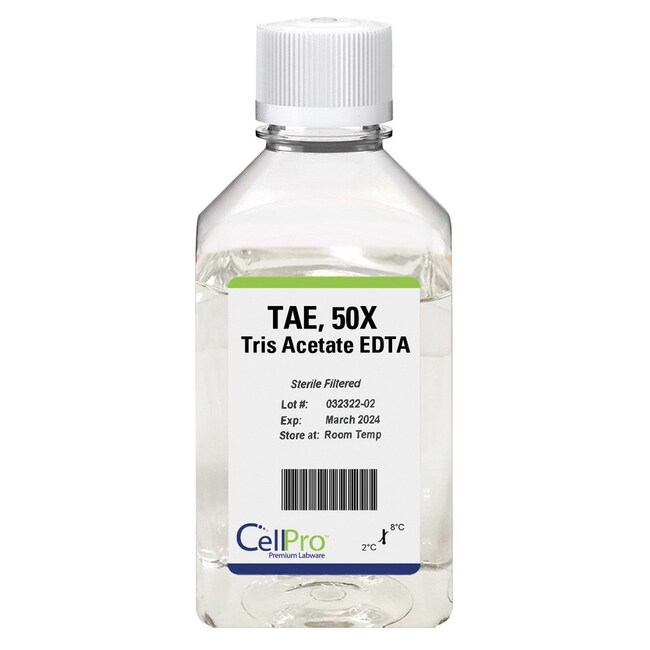 Alkali Scientific™ CellPro™ TAE Tris Acetate EDTA is a fundamental reagent in nucleic acid electrophoresis, renowned for its exceptional buffering capacity and DNA solubilization properties. Designed to provide optimal performance and reproducibility, this solution enables precise separation and analysis of DNA fragments in agarose gel electrophoresis. Each batch undergoes rigorous sterile filtration to ensure purity and consistency, empowering researchers with confidence in their molecular biology experiments.