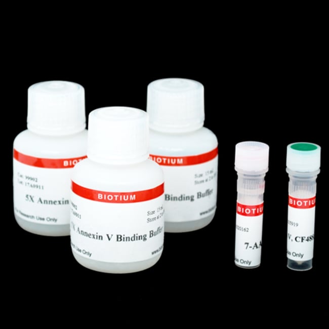 This kit contains CF488A Annexin V for staining apoptotic cells green, and 7-AAD for staining necrotic cells with far-red fluorescence, for detection by flow cytometry or fluorescence microscopy. Annexin V labeled with CF488A (Abs/Em= 490/515 nm) can identify apoptotic cells in green by binding to phosphatidylserine (PS) exposed on the outer leaflet. Our CF488A dye is superior to fluorescein/FITC as it is not affected by pH and has much better photostability. 7-AAD is a membrane-impermeant nucleic acid dye that is excluded by live cells, but stains necrotic cells and late apoptotic cells. 7-AAD (Abs/Em with DNA = 543/655 nm) emits in the far-red spectrum and can be well separated from CF488A and other green emitting dyes using the 488 nm line of a flow cytometer. The kit has reagents sufficent for 100 assays.