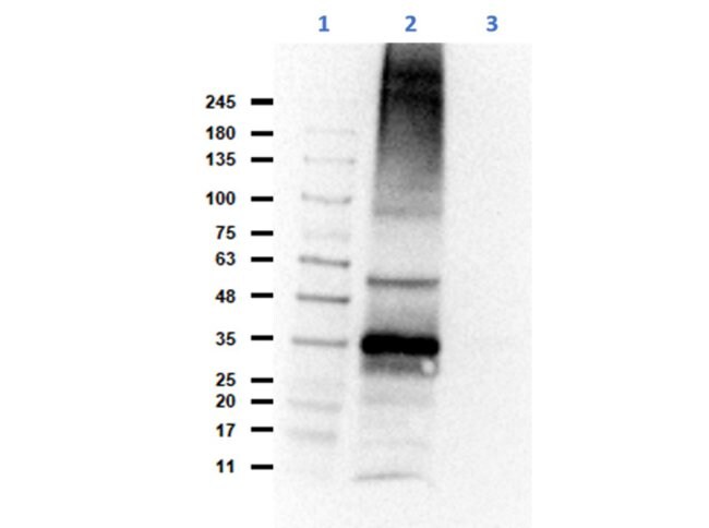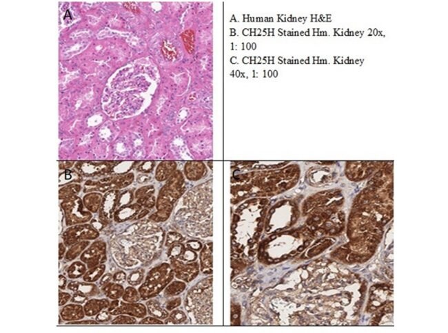 Store vial at -20°C prior to opening. Aliquot contents and freeze at -20°C or below for extended storage. Avoid cycles of freezing and thawing. Centrifuge product if not completely clear after standing at room temperature. This product is stable for several weeks at 4°C as an undiluted liquid. Dilute only prior to immediate use. This affinity purified antibody is directed against human CH25H. A BLAST analysis was used to suggest cross-reactivity with the antigen based on 100% homology with the immunizing sequence and 92% homology to pig, 91% homology to rat, and 75% homology to mouse.