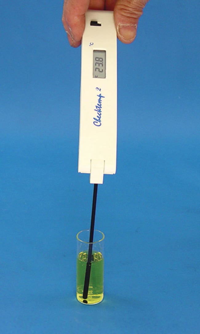 Checktemp 4 thermometer is fast responding, fold-away probe is made of high quality, stainless steel. It enables angled measurements and can penetrate semi-frozen and semi-solid samples. The LCD on the side of the handle is easy to see and read.