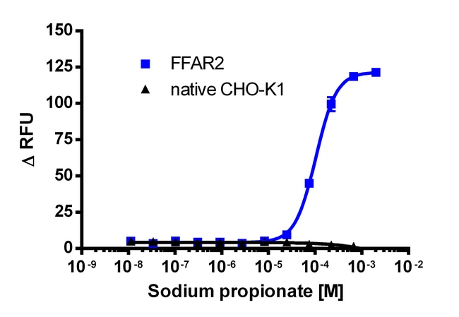 The FFAR2 (GPR43) Gq cell line is a stable, engineered cell line for use in studying drug candidates (small molecules or biologics) targeting GPCRs. This cell line enables assessment of ligand (e.g. FFAs) based activation of FFAR2 GPCR activity via detection of increasing levels of intracellular calcium. The included cell line overexpresses FFAR2, a naturally Gq coupled GPCR. Upon activation of FFAR2, the resulting calcium activity can be fluorescently assayed using the Calcium No WashPLUS Detection Kit. This stable modified cell line is provided as two vials of cryopreserved cells. For detailed product information, User Manual and datasheet, visit www.discoverx.com/gpcr.