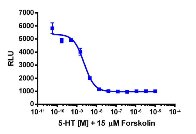 The cAMP Hunter HTR1A Gi cell line is a stable, engineered cell line for use in studying drug candidates (small molecules or biologics) targeting GPCRs. This cell line enables assessment of ligand (e.g. serotonin/5-HT) based activation of HTR1A GPCR activity via detection of decreasing levels of intracellular cAMP. This product uses EFC technology. The cells overexpress wild type HTR1A, a naturally Gi/Go coupled GPCR. Upon activation of HTR1A, the decrease in levels of intracellular cAMP leads to a decreased signal from EFC when the cAMP detection kit is applied. This stable modified cell line is provided as two vials of cryopreserved cells. For detailed product information, User Manual and datasheet, visit www.discoverx.com/gpcr.