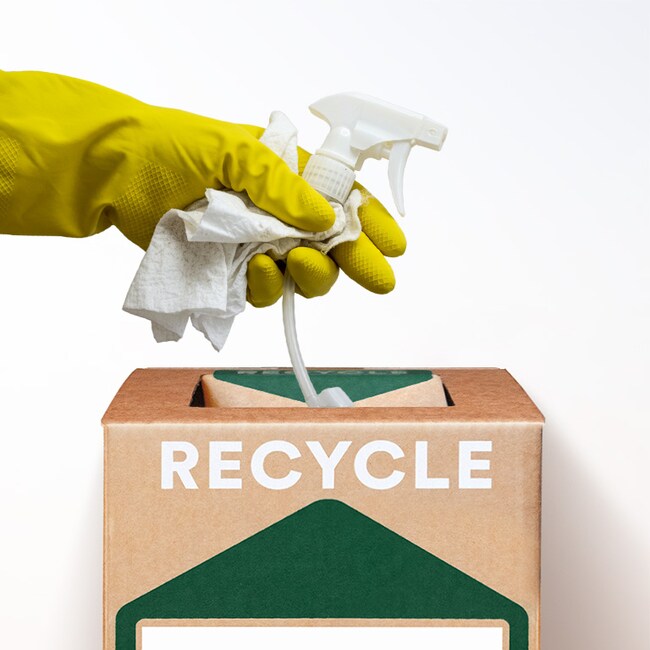 - Use this Zero Waste Box to recycle empty non-hazardous cleaning items and packaging, including: plastic brooms, mops, buckets, synthetic dry cleaning pads, synthetic wet cleaning pads, dust pans, empty spray bottles, empty detergent bottles and nozzles, empty cleaning product bottles, lid tops, and dryer sheets. Does not accept aerosol cans, solvents, other household materials, such as, drain cleaners, oven cleaners, toilet cleaners, disinfectant, degreasers, all-purpose cleaners, detergents, bleach, fabric softeners, wood, bamboo, or any biodegradable, heavily soiled, contaminated, or hazardous materials.