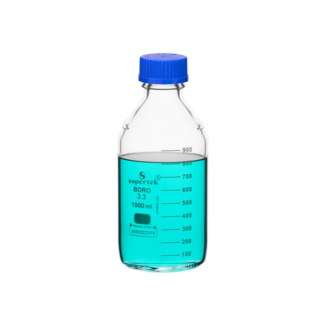 Supertek™ Clear Glass Graduated Reagent Bottles with Screw Caps and Drip-Free Pouring Rings