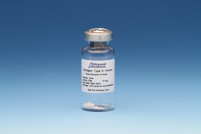 Type III Collagen provides structure and strength to connective tissue, is found many places in the body, especially skin, lung, intestinal walls and the walls of blood vessels. This Type III Collagen product is isolated from human placenta and is purified using a multi-step process with approximately 85% Type III collagen with the remainder being comprised of Type I collagen. The product is supplied as a non-sterile powder. A Certificate of Analysis is available with the purchase of each product. Type III collagen product is provided in a user-friendly packaging for use and storage.Type III Collagen is typically used as a thin coating on tissue culture surfaces or as a control. Specific instructions are found in the Directions for Use. This product is generally used in vitro as a substrate scaffold to enhance cell attachment, adherence and proliferation. Type III collagen may be used to culture a variety of cell types.